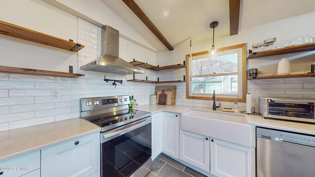 Well-crafted and impeccably renovated, don't miss out on this amazing Chalet with SEASONAL LAKEVIEWS! Three ample sized bedrooms with a Primary walk-in closet and a bathroom to help decompress the day away! Open concept kitchen with quartz countertops, stainless steel appliances, live wood-edged open shelving, and porcelain farmhouse deep sink with a matching island makes entertaining easy to the living and dining room! Wood floors with aesthetically pleasing tile throughout leaving neutral carpet in the bedrooms! Great storage in and outside with 2 sheds, mini-split with smart device capabilities in the living and dining room, and water ventilation systems in crawl space done during ownership! Location is key and this doesn't disappoint! STEPS away from Gold Key's 120 naturally-glacier fed acre STOCKED LAKE, Restaurant, recreational and adult lounge, along with playground and lodge accommodations! End your days with strolls to get your nightly ice cream at Jimmy's and bask in the sunset! All located in Delaware Valley School District with low taxes! Come see what the Pocono peace can offer you!