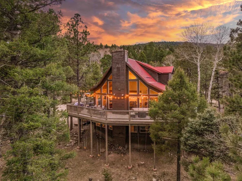 Nestled at the serene north end of Via del Rey, this inviting home sits on an expansive lot, offering a rare blend of privacy and convenience just minutes from the heart of Angel Fire. Step inside to a sunlit great room featuring soaring ceilings, a dramatic wall of windows, and captivating views of the ski area. Gather around the wood-burning fireplace for cozy evenings after a day of mountain adventures. The well-appointed kitchen boasts ample counter space and all the essentials for home-cooked meals, with seamless access to the wraparound deck—perfect for morning coffee or evening relaxation under the stars. The main level includes two guest bedrooms and a full bath, while the private primary suite upstairs offers a sunny sitting area and a generous ensuite bath with a relaxing soaking tub. Downstairs, a second living area with its own wood stove and full bath is ideal for game nig...