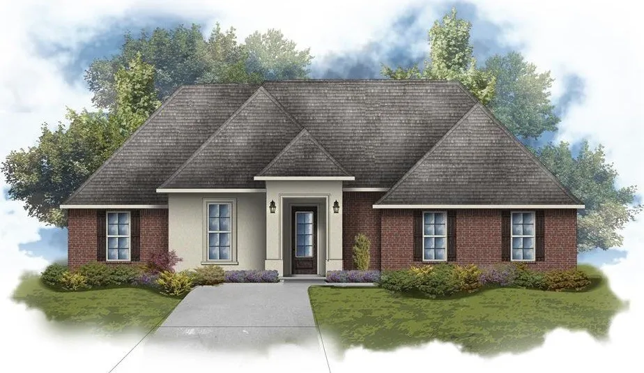 Features: double vanity, garden tub, separate shower, linen closet, and a walk-in closet in the primary suite, tray ceiling in the primary bedroom, double vanity in the second bathroom, a kitchen island overlooking the dining area, large walk-in pantry, mud room with boot bench, side-entry garage, covered rear patio, ceiling fans in the living room and primary bedroom are standard, smart connect wi-fi thermostat, smoke and carbon monoxide detectors, a post tension slab, landscaping, architectural 30-year shingles, flood lights, and more!