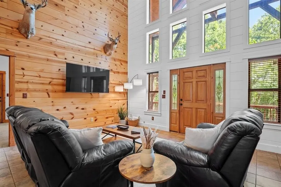 Rocky Road cabin comes fully furnished, turn key ready and sits on a private, peaceful hillside with gated entrances and is exceptionally captivating and spacious!! This 3 bedroom, 2.5 bath with a touch of modern truly captures the essence of tranquility and comfort. Surrounded by towering pines, you are welcomed with a beautiful wall of windows, gorgeous Y-frame supports, and a circle drive with additional parking. Explore the awe-inspiring interior to discover voluminous vaulted ceilings, luminous custom windows, beautifully new painted white accent walls, stunning knotty pine, and durable tile flooring. Ideal for hosting friends, the organically flowing layout dazzles with an expansive living room. Remain part of the party in the open concept kitchen, which has stainless-steel appliances, fresh white accent walls that complement the natural wood tones and a breakfast bar island for fa...