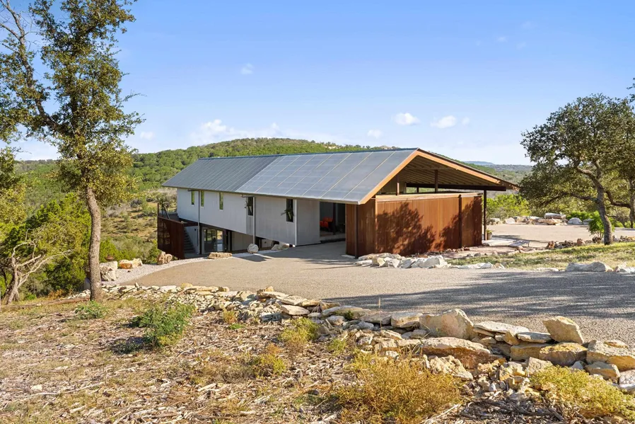 Perched above the rolling hills and limestone outcrops of the gated Wolf Creek Ranch community, this architecturally stunning home by LOWDO captures breathtaking vistas of valleys, trees, and sunlit ridgelines near Lake Buchanan. Designed to harmonize with its surroundings, the home rests on a steel pier-and-beam foundation, minimizing land impact while maximizing views, light, and airflow. The private drive leads through 23.07 acres of scenic terrain where free-ranging cattle help maintain the Agricultural Exemption. A 29,000+ -gallon rainwater collection system with full filtration captures approximately 2,510 gallons per inch of rainfall, and the home is solar-array ready with a south-to-north orientation. Entry through an exterior “potting room” foyer transitions beautifully from outdoors to in, leading to an open-air courtyard that fills the interior with natural light and Hill Coun...