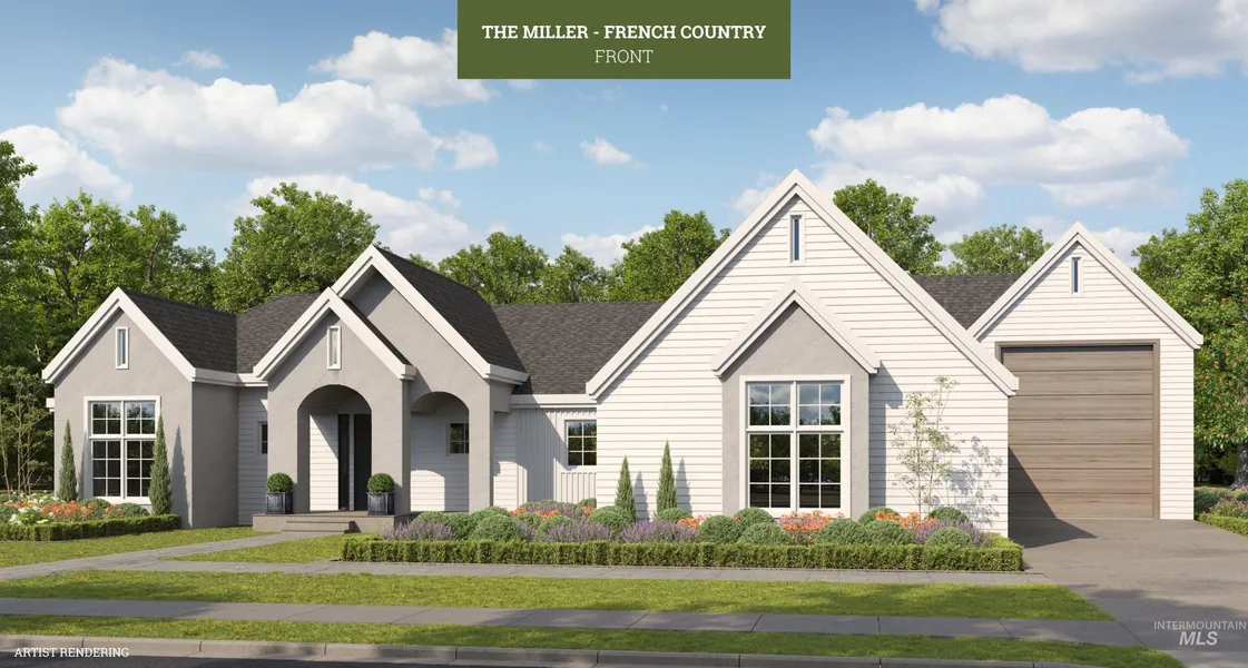 PreSold. The Miller (French Country) combines modern American living with rustic country French appeal. Its split-bedroom layout centers around a grand great room, featuring a spacious kitchen and rows of picturesque windows that open to a sprawling covered rear patio. Standard features include 8' doors, a gas fireplace in the great room, quartz kitchen countertops, Bosch stainless steel appliances, LVP flooring, and premium carpet. Smart home upgrades like a Ring Doorbell and Nest Thermostat add convenience, while a gas line stub on the back patio makes outdoor cooking easy. The buyer upgraded to a 65' deep RV garage to accommodate an 17' x 15' attached shop. Located in Middleton’s Waterbrook Farms, this exclusive community features 26 homesites in a peaceful country setting, just moments from Purple Sage Golf Course.