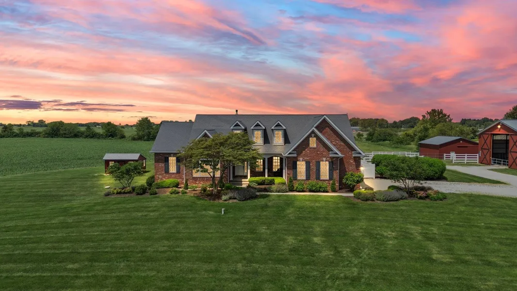 Experience the best of country living with city convenience at this gated 20-acre equestrian estate near the Illinois-Indiana line. Perfectly positioned for commuters, yet surrounded by peaceful farmland, this property offers the rare combination of privacy, productivity, and purpose. At the center sits a solid, custom brick ranch with cathedral ceilings, open-concept living, and Hickory hardwood floors bathed in natural light. Step out to panoramic views of rolling acreage, where horses graze and wildlife roams. Enjoy mornings with coffee on the porch, evenings under wide Indiana skies, and the freedom of space you simply can't find closer to Chicago. For equestrian enthusiasts, the property is thoughtfully laid out with a Morton indoor arena, outdoor arena, six stalls, another Morton building for Hay storage or more, and usable pasture/hay fields. Instant income from the surrounding farm fields utilized for grain farming. The home is equipped for resilience with a full-farm generator and a 2021 furnace, ensuring comfort year-round. A separate well is utilized by the barns, room to grow and unfinished loft space to utilize as you see fit. Indiana's lower taxes paired with proximity to Illinois make this property an exceptional investment for those seeking both lifestyle and practicality. This isn't just a home--it's a once-in-a-lifetime opportunity to create the life you've been imagining: room to breathe, space to grow, and a legacy of living connected to the land.