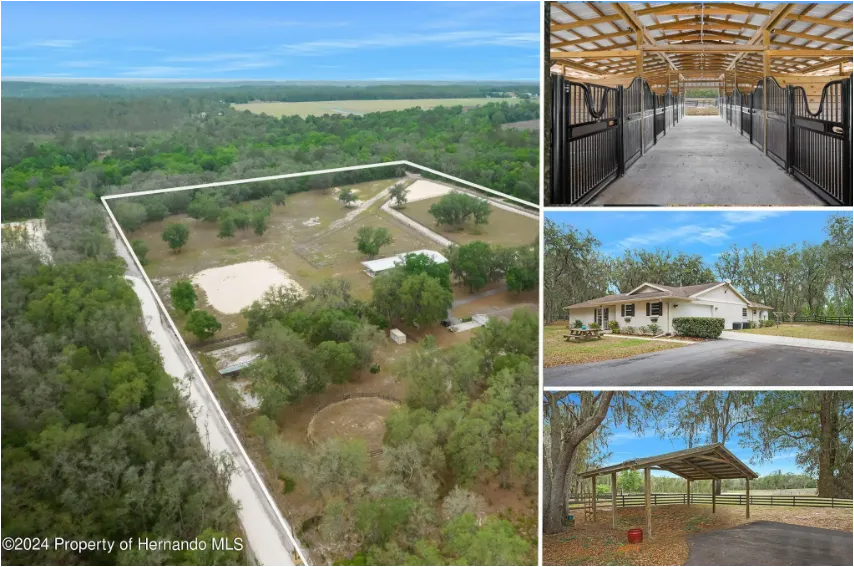 20-ACRE HORSE RANCH for sale off beautiful BATTEN ROAD in Brooksvile!! 3 bedrooms + 2 bathrooms + 2 car attached garage + AMAZING LUXURY center-aisle HORSE BARN with 8 stalls + apartment + tack room + covered hay storage + round pen + riding ring + completely fenced + board fencing + multiple pastures + pole barn...all on 20 private acres located in the highly desirable Spring Lake area of Brooksville, situated 230 feet above sea level. Nestled at the dead end of a long, paved easement, this peaceful country farm offers a lot of privacy. Conveniently located 15 min to I-75, 45 min to Tampa, and less than 1 hr from Ocala. The property is homesteaded and green belted, saving you thousands per year on taxes! NO FLOOD! NO HOA and zoned AG! So bring the RV, camper, boats, ATV's, horses, animals...bring it all! HOME: The 3BR, 2BA one-level block home has 2,355 square feet of living space with plenty of open area for entertaining. Remodeled with matching stainless steel appliances in the kitchen and gas stovetop, updated Master bathroom, new roof in 2016, cedar ceiling in lanai, new A/C system 2019, water heater, and gutters. The well was upgraded to a 2-Horse pump with oversized holding tank and new well piping. 2-car attached garage plus a pole barn for additional parking. Paved driveway under the shady oak trees leads to the house and pole barn. BARN: The best part of the property! This new custom-built barn was designed by an equine professional and looks like it belongs in Wellington. 8 stalls in the center-aisle barn, each is 12' x 12' with a 24' covered run-out. Dutch doors on the back of the stalls can be kept open to allow access to the run-outs or closed. Each stall has a 4' thick stall mattress. So comfortable! Imported European stall fronts with swing-out feed doors and optional U-shaped yokes to put in the stall door for stallions. Water piped to each run-out, eliminating the need for carrying and filling water buckets. Only agriculture sealed-motor fans are used in the barn. The cross tie area has hot/cold water and a hose boom to keep the hose off of the floor. The barn has its own water softener, septic tank, hot/cold water in every room, and A/C in every room. The hay area holds up to 9 pallets of hay, with Dutch doors in the aisle and a garage door in the back for deliveries. Full bathroom with toilet, sink, shower, washer, dryer, and water heater. The feed room has a commercial stainless-steel sink and matching table for feed prep. The tack room is 12' x 36' and could easily be converted into an apartment. Tack room has a new fridge, sink, custom-built cabinets, and granite counter tops. Epoxy flooring in feed room, bathroom, and tack room. New gutters. Recessed lighting in every room, beautiful outdoor lights all down the barn aisle, spot lights in each stall, motion-sensor lights on exterior, waterproof lights in cross tie areas, and a chandelier. EXTRAS: 8 oversized raised garden beds, fruit tree, and custom-built chicken coop. Acres of fenced pastures, individual paddocks, and a paddock track system. All new wood fencing with walk-throughs in paddocks. Oversized run-in shelter, shipping container with garage doors for extra storage, and 2 extra stalls outside. Extra-large 80' round pen, outdoor cross ties, and 150' x 200' riding area. Water and electric hook-up added for an RV or LQ horse trailer. Barn/pastures are currently being leased for $2200/month. Lease ends July 2025.