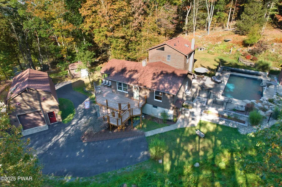 Welcome to a luxurious rustic retreat, where comfort and tranquility await at this vacation-inspired 1-acre country estate in desirable Shohola, PA. From the moment you arrive, the lush landscaping and meticulous care of this property will impress. Step outside to your own private resort, featuring a grand saltwater pool with stone waterfall, swimming slide, pool house shed, multi-tiered gardens, and a fully fenced-in design for privacy. An oversized two-story Gambrel-style garage offers ample space to showcase every toy or project, complemented by a large carport and custom chicken house with coop. Inside, the open floor plan shines with gleaming hardwood floors, a spacious living room with a gas fireplace, and a chef's kitchen with stainless steel smart appliances, granite countertops, gas stove, and tile flooring. The full dining room sets the stage for gatherings, while the private primary suite occupies its own floor for added seclusion. The fully finished lower level provides endless options, including a family or entertainment space, weight room, or home office. Perfectly situated just minutes from Historic Milford, Ski Big Bear, Lake Wallenpaupack, Route 6, and I-84, this home offers the best of Pocono living with no HOA and no dues. A rare opportunity to own a private, resort-style property in a prime location--this is one you won't want to miss!