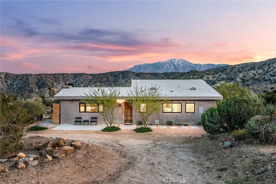 Dramatic mountain views envelop you from all directions in this artist-designed mid-century retreat spanning 5 serene acres under the majestic backdrop of Mt San Jacinto. The original 1959 brick cabin serves as an open concept living & dining area with soaring exposed beam ceilings, a cozy wood burning fireplace, built-ins, and a modern kitchen complete with quartz countertops, new copper plumbing, and a clever hidden under-counter fridge. A thoughtfully curated 2022 renovation introduces a chic new primary bedroom, oversized bathroom, bonus sleeping loft, and mini splits for climate control. The generously sized bedroom features a walk-in closet and built-in office nook, punctuated by a wall of glass sliders inviting you to take in the striking outdoor panorama. Down the hall you’ll find a hidden stackable washer & dryer and a spa-like bathroom with venetian plaster, dual sinks, a soaki...
