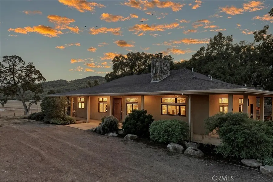 Experience tranquility in this stunning single-level modern stucco home on 23.57 acres, surrounded by majestic oaks and scenic meadows. The open floor plan features soaring ceilings, heated vinyl plank flooring, and a cozy fireplace. The chef's kitchen boasts top-tier appliances, a sleek European-style hood, and a spacious island with built-in seating and wireless charging. The dining area offers beautiful views and access to the private backyard.