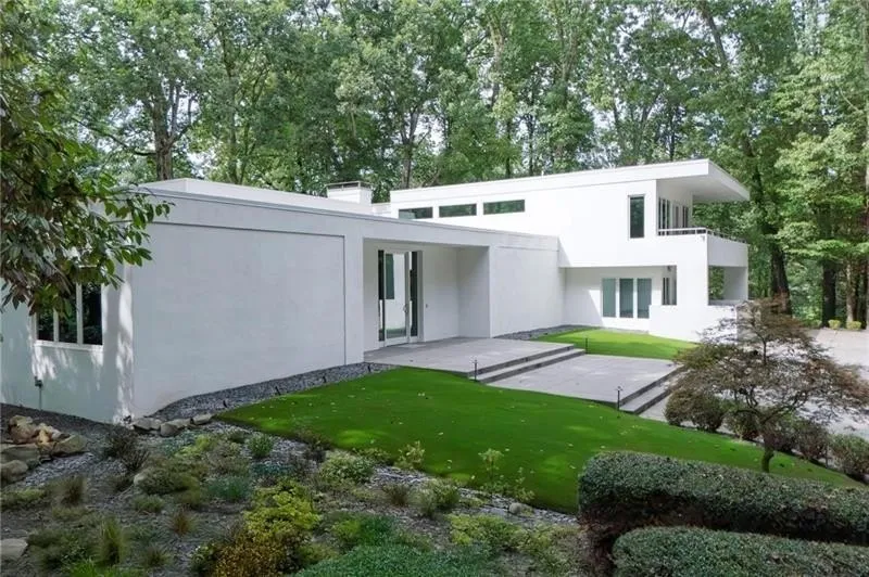 This spectacular contemporary estate on 2.5 private acres stands as a true landmark in Buckhead's prestigious Paces neighborhood. Sophisticated in design yet warm and livable, the property offers a rare balance of modern architecture and everyday comfort. A private drive leads to an expansive motor court, mature landscaping, and a turfed front lawn, setting the stage for the home's striking entrance. Inside, a dramatic foyer with 12-foot ceilings introduces sun-drenched interiors framed by walls of windows, soaring ceilings, and sleek contemporary details. The main-level primary suite boasts a newly renovated bath and an oversized custom closet. Designed for both everyday living and grand entertaining, the main level showcases a vast living room that also functions as a formal dining space for 12+, anchored by a large wet bar ideal for gatherings. Additional highlights include a private office, stylish powder room, and a comfortable family room. The chef's kitchen features stone counters, SieMatic cabinetry, Gaggenau ovens, an 8-burner Russell gas range, and a wine refrigerator, and flows seamlessly into a fireside breakfast room overlooking the lush, private backyard-complete with ample space for a future pool. Upstairs, two bedrooms and two bathrooms are complemented by a spacious bonus room that opens to a covered deck, perfect for year-round outdoor enjoyment. A possible fourth bedroom, currently serving as an office, enhances the home's flexibility. New windows throughout fill the interiors with natural light and frame views of the surrounding greenery. Outdoor living is equally impressive, with porches on both levels, expansive lawns, and multiple areas designed for recreation, relaxation, and entertaining. Located in the sought-after Jackson Elementary district and close to Buckhead's premier dining, shopping, and schools, this remarkable estate offers an unparalleled lifestyle in one of Atlanta's most coveted neighborhoods.