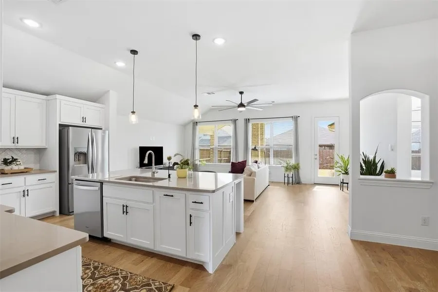 Immaculately maintained and move-in ready, this 2022 single-story residence is nestled in the desirable Marine Creek Ranch community. The open, light-filled floor plan showcases refined finishes and a seamless flow from the spacious living area into the chef-inspired kitchen with a large island, gas cooktop, walk-in pantry, and elegant eat-in dining space. The private primary suite is enhanced by large windows that fill the space with natural light and offers a spa-like retreat with a garden tub, thoughtfully designed shower, separate vanities, and an expansive walk-in closet with custom built-in cabinetry, all ensuite to the bedroom. A dedicated office or flex room provides versatility for working from home, fitness, or additional living space. Neutral, sophisticated tones elevate the home’s modern aesthetic throughout. The covered back patio extends the living space outdoors, with a privacy-fenced backyard ready to be customized to your lifestyle. A two-car garage with interior access completes the home. Marine Creek Ranch features sidewalks and scenic jogging and biking paths, with convenient access to shopping, dining, major highways, and Eagle Mountain-Saginaw ISD.