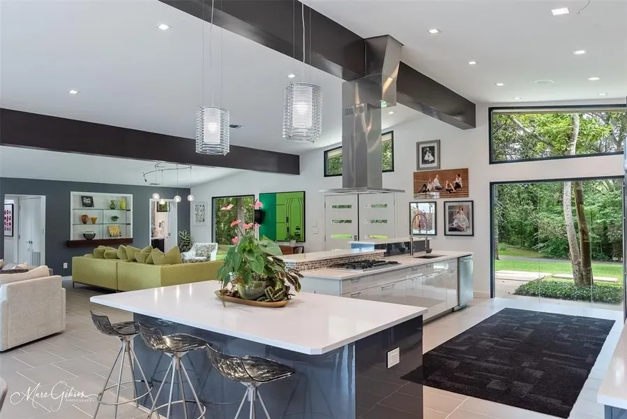 A captivating Mid-century modern masterpiece nestled on a quiet road, outside of city limits without city taxes or HOA, adjacent to East Ridge Country Club, #2 Tee Box. Completely remodeled in 2013, this private sanctuary offers panoramic views of the golf course as well as a private yard, offering an ideal blend of luxury & tranquility. Exceptional entertaining spaces with open living concept, wood-burning fireplace and multiple living areas, and crisp tile floors enhance the seamless connection between indoor and outdoor living spaces. Expansive great room is a sunlit haven with floor-to-ceiling windows that invite the beauty of the outdoors in. Formal Powder Room. Chef’s Kitchen features GE Monogram appliances, sleek, high-gloss slab front Crestwood cabinets, additional beverage storage, coffee bar with glass-front cabinets, double islands w white quartz countertops + seating & storag...