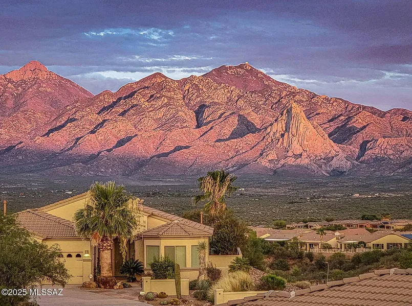 Discover an exceptional resort lifestyle in this gorgeous home that perfectly blends luxury with comfort. Along with breathtaking mountain views, this residence features 2 bedrooms, 2 baths, a den, and sits on a rare 1.135-acre lot that offers the privacy and quiet location you've been looking for. As you arrive, a charming paver courtyard welcomes you—an ideal spot to relax and take in the stunning views. Inside, the home flows seamlessly with a spacious living room highlighted by wood plank tile flooring, creating a warm and inviting atmosphere. The beautifully remodeled kitchen is truly the centerpiece, showcasing custom-built cherry cabinetry with pullouts, exquisite granite countertops, a stylish backsplash, and modern pendant lighting. High-quality stainless steel appliances complete the space, including a brand-new refrigerator (2025), a desirable gas range, and a newer dishwasher (2024). The kitchen opens to a bright dining area surrounded by windows that frame the vistas. The owners' suite with coffered ceilings offers access to the backyard, a walk-in closet, and an in-suite bathroom with double vanity, updated cabinetry, a large walk-in steam shower, and a separate garden tub. Your guest will feel right at home in the guest bedroom with a bay window that offers mountain views and the guest bath with a shower-tub combo. The versatile den is perfect for use as an office or TV room. The large laundry room with a new washer and dryer ( 2024) offers the perfect space for hobbies with a built-in desk, plenty of cabinets, and even a sink. Relax and enjoy the panoramic, breathtaking mountain views in the backyard with an extended porch, fountain, rolling shutters, manual rolling shades, and beautiful mature landscaping, including fruit trees. Enjoy the privacy of the large lot without the hassle of yard work, as a portion of it is a natural desert wash with low-maintenance landscaping. Practical updates include a new roof (2022), a newer water heater (2022), a water softener, a reverse osmosis system, and some newer windows. The garage also offers cabinets for additional storage. This home's prime position places you just minutes from Canoa Ranch Golf Course, Canoa Ranch GVR Center, and easy access to I-19. Whether you enjoy golf, recreation, or exploring the beauty of Southern Arizona, this property combines privacy with accessibility. Age restricted 55+. GVR membership.