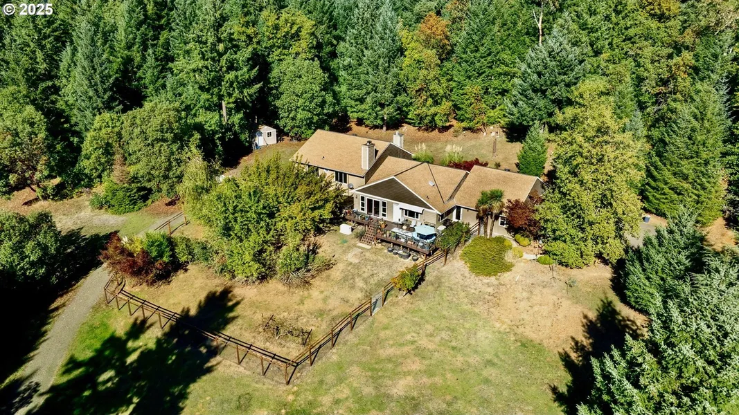 COUNTRY LIVING IN COVETED MELROSE - TWO FAMILY SETUP ON 5 ACRES! Nestled in the highly desirable Melrose area, this beautiful 5-acre property offers the perfect blend of country charm, privacy, and versatile living space. The main-level home features 4 bedrooms and 2.5 baths, designed for comfort and entertaining. A massive kitchen is the heart of the home, complete with a gourmet gas cook island, two pantries, and abundant counter space for the inspired home chef. The spacious living room features vaulted ceilings and large windows that fill the home with natural light, while the family room and formal dining area provide plenty of room for gatherings. Step out onto the elevated deck and take in the serene views of mountains, fir trees, and open yard area for deer and wildlife. The large primary suite includes a walk-in closet and an ensuite bathroom with double sinks and a tiled walk-in shower. The main level also offers a conveniently large laundry room with plenty of storage. Downstairs, a fully equipped second living quarters provides flexibility for multi-generational living or guest accommodations. It includes 1 bedroom, 1 bath, two living areas, and a slider to a private patio with a peaceful outdoor setting. Outside, enjoy mature fruit trees, firs, and a circular driveway that enhances accessibility and curb appeal. There is a large flat treed area where a large shop could be added after removing some trees, if desired. Tucked at the end of a quiet road, this property offers true privacy while remaining close to town amenities. Recent upgrades include a whole house automatic generator. Experience the best of Melrose country living — spacious, serene, and perfectly suited for extended family or dual living. Come see what this extraordinary property has to offer!