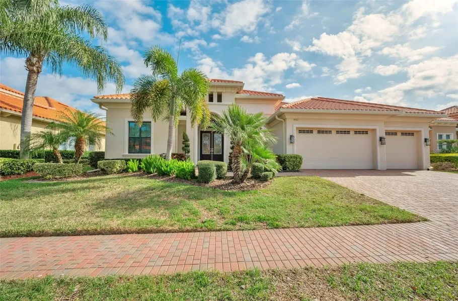 Welcome to the exclusive, gated community of Champions Club, where a true sense of community meets refined living. This spectacular custom-built Arthur Rutenberg home offers striking contemporary design and exceptional craftsmanship throughout. A pavered driveway, sidewalks, and walkways lead to elegant double front doors with metal and glass inserts. Upon entering, the foyer impresses with an inlaid patterned tile floor. The formal dining room features a dry bar with wine cooler and a built-in niche, complemented by a tray ceiling with double crown molding. The expansive great room showcases espresso-stained ceiling beams, creating a sleek architectural statement. A feature wall with an electric fireplace provides the perfect backdrop for a wall-mounted TV, while a display niche highlights artwork and collectibles. A full wall of stackable sliding glass doors opens to the lanai and pri...
