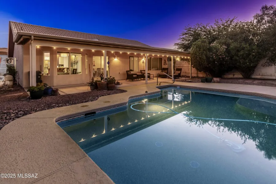 Enjoy entertaining in your private backyard oasis with sparkling pool, new Kool decking, and a covered, illuminated patio perfect for relaxing or hosting friends. This Contemporary Diego model offers tile floors in all the right places and an inviting living room ideal for quiet reading or a grand piano. The open kitchen features stainless appliances, breakfast bar, and bay windows in the nook, overlooking the great room and pool. The spacious owner's suite includes dual vanities and separate shower, while a large hobby room/office adds versatility. Laundry leads to the extended garage with storage, newer HVAC and hot water tank. A comfortable guest room and bath complete this home. Some Furniture Available on a Separate Bill of Sale. Don't you deserve to Retire in Style at SaddleBrooke, Tucson's #1 Active Adult Community.