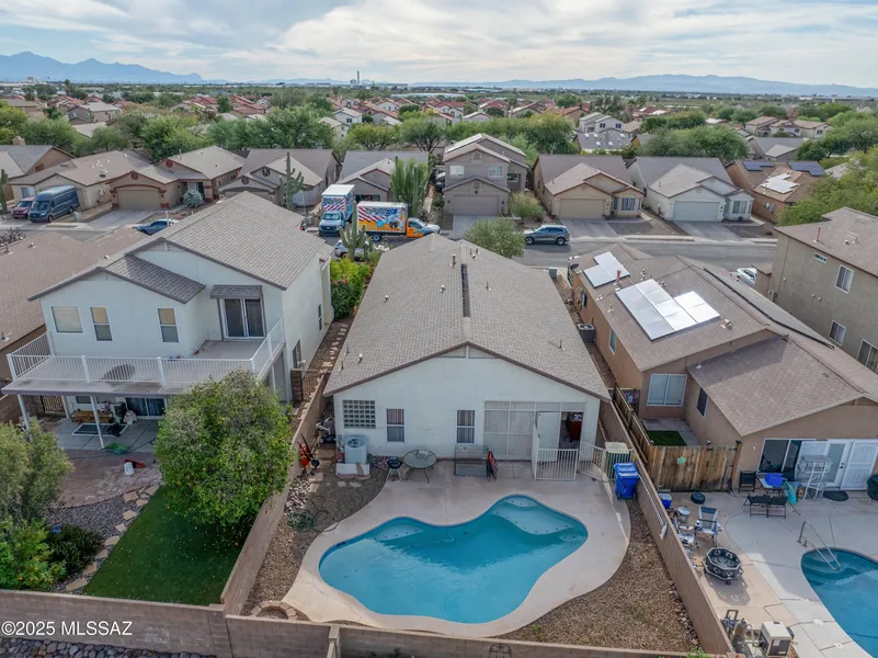 Everything you're looking for in Tucson living! This charming 3-bedroom, 2-bath home checks all the boxes, including a refreshing swimming pool! Enjoy tile flooring throughout the main living areas and a bright kitchen featuring light wood cabinetry, stainless steel appliances, and a convenient pass-through window to the dining space. The primary suite offers a remodeled tub/shower area with travertine tile surround and a nice soaking tub plus a spacious walk-in closet. Important updates have already been taken care of — roof replaced in 2014, poly pipes replaced with PEX, plus a newer AC unit and garage door with newer opener. An enclosed patio adds flexible space for relaxing or pets, and both front and backyards are designed for easy maintenance. Best of all, you'll love cooling off in your own private pool the perfect retreat for Arizona summers!