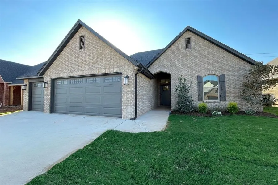 This beautiful new home in Castlewood Trails features the Montauk floor plan and Fresh & Airy design package. The entry opens to a spacious living room with wood tile floors, gas fireplace, and large windows overlooking the back porch. Flowing into the kitchen, it boasts a large island, walk-in pantry, pull-out trash, and ENERGY STAR appliances. The dining area, filled with natural light, opens to the back patio—perfect for entertaining. The private primary suite offers a tub, walk-in shower with Schluter waterproofing, and a large closet with direct laundry access. Three additional bedrooms share a full bath and linen closet. The laundry room connects to the garage and has extra storage. Sitting on a 0.15-acre lot, this home also includes a healthy air filtration, tankless water heater, and sprinkler system. Built for superior energy efficiency, comfort, and air quality with 2"x6" walls, spray foam insulation, a water/moisture barrier, high-performance windows, a precision HVAC system, post-tension foundation, and more. Castlewood Trails is ideally located near Route 66 and the Kilpatrick Turnpike, with amenities like a playground, splash pad, picnic area, and trails. Stock Photography used; features and finishes may vary. Floor Plan represents the base plan; some variations may occur.