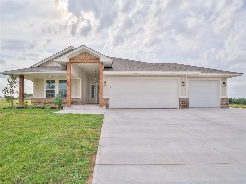***TAKE ADVANTAGE OF OUR SAVINGS THIS WEEKEND WITH $5,000.00 TOWARDS WHATEVER YOUR NEED! WANNA TAKE A VA-CA, PAY YOUR CLOSING COSTS, PAY OFF A CREDIT CARD, SAVE IT FOR A RAINY DAY! WE UNDERSTAND AND WANT YOU TO SPEND THIS MONEY YOUR WAY***As you step onto the welcoming covered porch adorned with charming accents, an immediate sense of comfort envelops you. Take a deep breath and relax—this is home, with half an acre providing a spacious buffer between you and your neighbor. Enter the open living area, featuring beautiful wood beams and a carefully designed fireplace for the ultimate in coziness. The open concept kitchen boasts a decorative vent hood, a generously sized center island, quartz countertops, a spacious pantry, custom cabinetry with a double trashcan pullout drawer, and delightful aesthetic touches. Retreat to the primary suite, adorned with a ceiling fan and bathed in natural light from low-E windows. The primary bathroom offers dual vanities, linen storage, a garden tub, a tiled shower, and a generously sized closet. The secondary bedrooms feature oversized closets, and the guest bath includes a tiled shower/tub combo and floating shelves. The laundry room is well-equipped with built-in cabinets and floating shelves, while the back patio door comes with built-in blinds. For added convenience, a gas line is included on the back patio. With a 10-year warranty and manufacturer warranties, maintaining your home is a breeze.