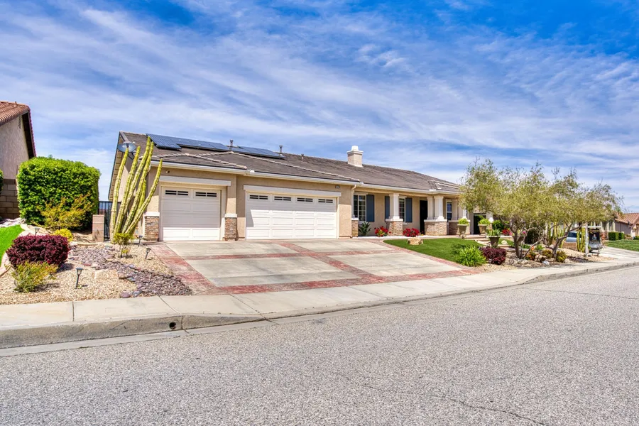 Welcome to this a meticulously maintained single-story residence nestled in one of West Palmdale's most sought-after neighborhoods. Boasting 5 spacious bedrooms **(1 bdrm used as Den, 1 bdrm convt to massive primary closet, both easy to convert back)** 3 full bathrooms, and over 3,300 square feet of living space, this home offers an exceptional blend of comfort, style, and entertainment potential. Interior Highlights: Open Concept Living with an expansive formal living and dining areas seamlessly flow into a grand living room, creating an inviting atmosphere perfect for gatherings. Gourmet Kitchen: At the heart of the home, the chef-inspired kitchen features granite countertops, stainless steel appliances, a center island with seating, and an eat-in dining nook. Ample cabinetry and counter space make meal preparation a delight. Private Quarters: The primary suite offers a tranquil retreat with views of the backyard oasis. Four additional bedrooms provide flexibility for family, guests, or a home office. Functional Spaces: A dedicated laundry room with a utility sink adds convenience, while the attached 3-car garage offers ample storage and parking. Outdoor Entertainment Paradise Expansive Lot: Set on a nearly 17,425 square foot lot(approximately .40 acres), the property provides abundant space for outdoor activities and future enhancements. Resort-Style Pool & Spa: The backyard isa private oasis featuring a sparkling in-ground gunite pool and spa with a soothing waterfall, ideal for relaxation and entertaining. Covered Patio: A spacious covered patio extends the living area outdoors, offering a perfect setting for al fresco dining, lounging, or hosting gatherings. Park-Like Views: Enjoy serene views of the surrounding neighborhood and distant mountains, enhancing the tranquil ambiance of the backyard. Additional Features Paid Solar Panels: Benefit from energy efficiency with the included paid solar system, reducing utility costs. Walking distance to Greg Anderson.