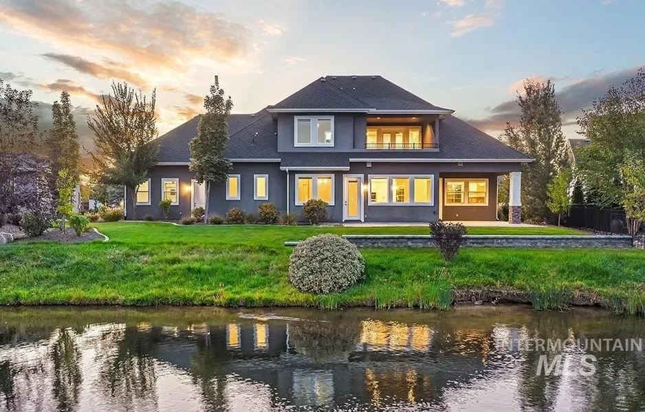 Waterfront luxury in Eagle’s premier Mace River Ranch! This immaculate, like-new residence offers quality finishes, comfortable elegance, and an unbeatable setting along glistening waters. Enjoy endless miles of the Boise River & Greenbelt trails, community pool & clubhouse, and friendly neighborhood gatherings—all minutes from downtown Eagle’s dining, shopping, & attractions. The home’s stone exterior, peaked rooflines, and strong columned details create timeless curb appeal, enhanced by a side-entry garage. Inside, engineered hardwoods lead to the great room where box-beamed ceilings, crown moldings, custom millwork, and expansive windows frame serene water views. A stone fireplace anchors the space, open to the gourmet kitchen with white cabinetry, warm wood island, quartz countertops, high-end appliances, marble backsplash, and walk-in pantry. Dining room with built-in seating overlooks the water. Main-level primary suite features spa-inspired bath with soaking tub, dual vanities, walk-in shower, and custom closet with pass-through to laundry. Dedicated office, guest room, and upstairs bonus with 2 bedrooms/baths plus balcony for sunset views. Covered patio & balcony with wood-clad ceilings complete this picturesque waterfront retreat.