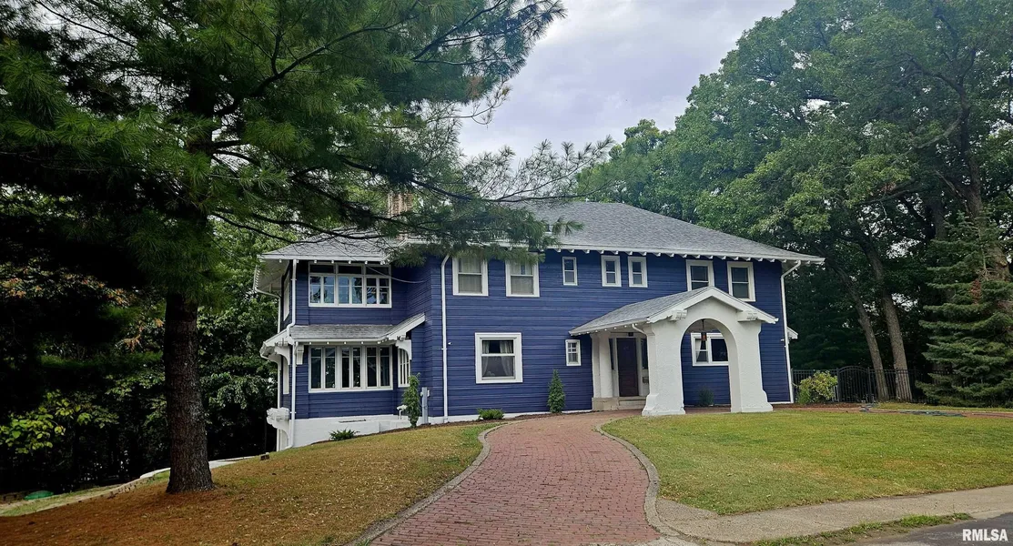 This historic home offers a balanced aesthetic, combining the austere elements of Spanish Mission with the natural features of Prairie Craftsman design. Original details like ornate penny tile flooring, intricate plaster ceiling design, multiple sets of French doors, half-barrel ceiling in the dining room with original lighting & carved sideboard reflect a bygone era. For an element of surprise, the house includes a secret stairway leading from the kitchen to the attic & hidden storage room beneath the stairs. Large windows in every room, including many windows in the basement. Dining room, complete with 10-foot-long table & hand-carved chairs, evokes the grandeur of yesteryear, while the veranda spans the length of the home, offering an inviting space for entertaining. Kitchen with modern stainless steel appliances & custom cabinetry crafted from trees harvested from the property, provides a contemporary kitchen blending with the home. Primary bedroom suite includes fireplace, large walk-in closet, & original sleeping porch repurposed as a family room. The updated full bathroom competes the primary suite creating a private retreat. Three bathrooms have been updated, yet an original full bathroom remains in the attic, serving the 3rd-floor bedroom. The home is bordered by woods, providing privacy & a connection to nature, further enhanced by the presence of abundant wildlife.