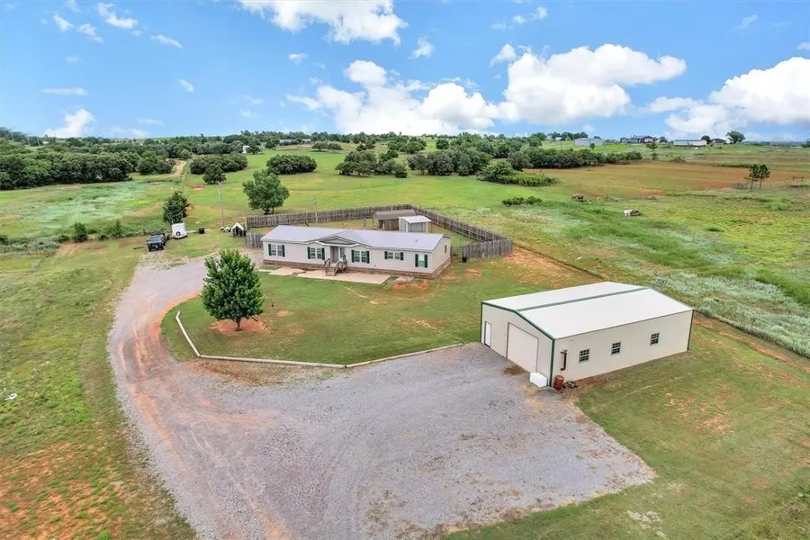Enjoy country living on over 5 acres! This spacious home features a split floor plan with four bedrooms, a large open living area, a home office and a kitchen with generous cabinet space. The main bedroom en suite includes a relaxing garden tub and an oversized walk-in closet. Outside, you will find a fenced backyard, two small storage buildings, a 30X50 metal shop with a garage door- perfect for projects, parking or extra storage and cellar.