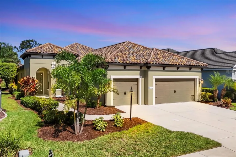 NO CDD fee for this home! This one of a kind ''Bright Meadows'' floorplan with heated pool boasts 3 bedrooms all containing generous sized walk-in closets with custom cabinetry, 2 full bathrooms, a large study/den, extended screened lanai, 3-car garage with epoxy flooring and overhead storage! This home is situated on a premium lake view with conservation area beyond the shimmering lake. With fresh exterior paint AND professionally installed landscaping, this house has it all! Rest assured your new home is built strong and safe with its HURRICANE IMPACT rated windows, motorized HURRICANE shades, block construction, concrete tile roof and is located in the desirable ''X'' floodzone! Throughout the home you will find plantation shutters for all windows, 5 1/4" deco baseboards, LED recessed lighting, BRAND NEW 16-seer rated TRANE HVAC, premium ceramic tile and much more! The kitchen boasts a large Island with breakfast bar, 4-burner natural gas stove, stainless steel appliances, and LED lighting underneath the premium cabinets that compliment the high level granite countertops. The great room with its expansive tray ceiling showcases a spacious environment with more than enough room to entertain guests. Open the large three paneled sliders and be amazed at not only the amount of room the extended lanai provides but your peaceful, mesmerizing lake AND conservation view. The upgraded travertine flooring complements the oversized 30' heated pool with water feature your new backyard oasis provides. Indigo is an active community that features a full time on-site manager as well as a full time activities director that manages an extensive calendar of activities for all ages. A-Rated Gullett Elementary AND Mona Jain Middle School are right outside our gates too! You can also expect sidewalks on both sides of the street, resort style heated community pool/spa at the clubhouse where you will find 5 cabanas with an abundance of seating, 4 pickleball courts, 2 bocce ball courts, 24-hour exercise gym, meeting room/banquet room and playground. Indigo is not only a community that takes care of all ground maintenance to include mowing, fertilizing, irrigation and shrubs but is right around the corner to a plethora of dining, banking, entertainment, public transportation and MORE!