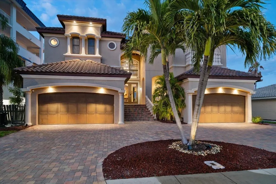 Nestled on one of Clearwater Beach’s most desirable residential streets, this stunning Mediterranean-inspired estate offers the rare combination of architectural presence, privacy, and resort-style outdoor living just moments from the beach. Designed for those who value both elegance and entertaining, the home makes a striking first impression with its grand façade, paver drive, and multiple garage bays, setting the tone for refined coastal living.