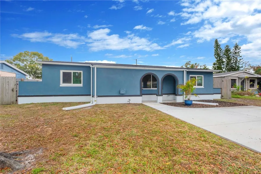 One or more photo(s) has been virtually staged. HONEY, stop the car! You do not want to miss out on this high and dry, concrete block home, offering three bedrooms, two full baths, and a bonus/media room located at the back of the home. As you pull up to the home on the one year old driveway, you will notice the front arch architecture that highlights the front elevation of this beauty. Entering the home, you cannot help but notice how open and light and bright this home feels. The living room is located right off of the kitchen and enough room for the family to entertain themselves with gaming or a night time movie. The gorgeous kitchen offers tons of storage for all of your cooking and entertaining needs. Just off the kitchen is carpeted den/office/yoga room that is next to the newly updated full guest bath featuring a walk in shower. The dining room has plenty of space for the family to enjoy a home cooked meal. The split bedroom floor plan offers privacy and the ability to have an office with tons of natural light when working from home. The bath located off of the primary bedroom offers a tub/shower combo and a single vanity. As you walk back through the home, you will find a set of French doors that lead to the side yard and the bonus/media room. Inside of the bonus/media room you will find a separate laundry room. The bonus room has a newer window air conditioner and features French doors that lead to the spacious backyard offering plenty of room for a pool, raised beds for home gardening, and fruit trees! The centralized location of this beautiful Pinellas County home offers everything you need in the way of parks, grocery stores, banks, gas stations, and has quick access to 66th St N. Schedule your private tour today!