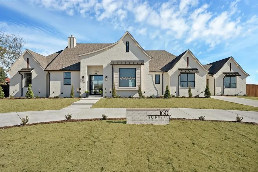 Gorgeous French Transitional custom home on 1.280 acres in Waxahachie. This elegant white-painted brick residence features a portico-style entry, a three-car garage, and an inviting open layout with high ceilings, hand scraped hardwood floors, and a stunning floor-to-ceiling fireplace with custom built-ins.