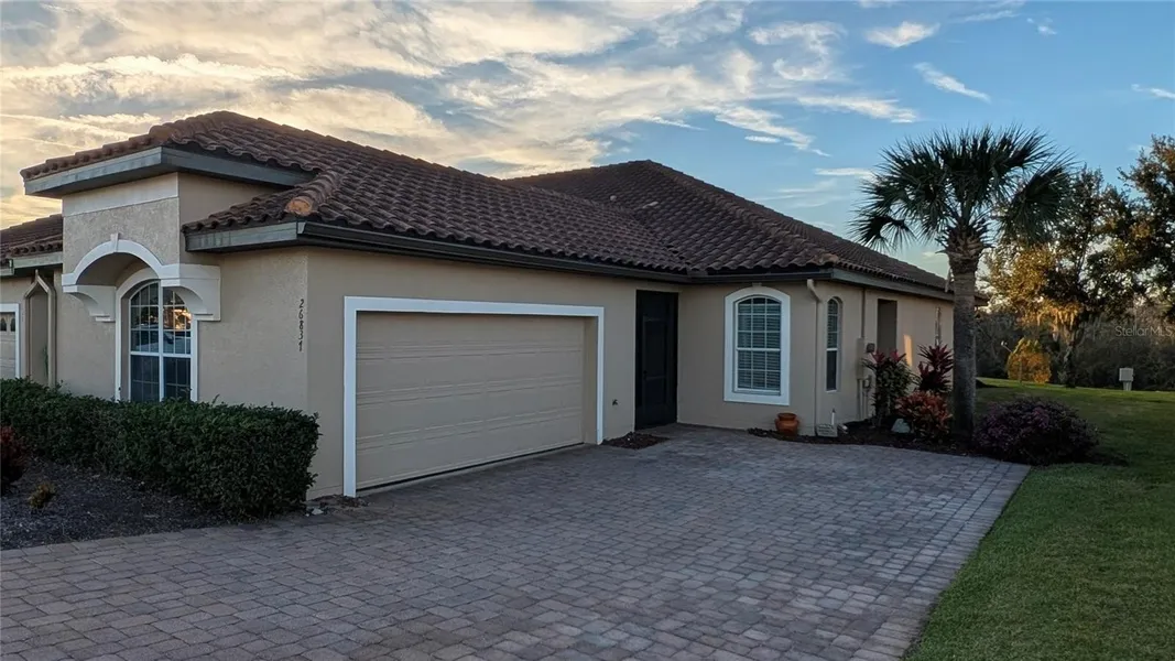 Step inside to an inviting open floorplan where natural light pours into the spacious great room. Triple sliding doors frame the fairway beyond and flow seamlessly onto the expansive screened-in patio—an ideal spot for morning coffee or sunset unwinding. The kitchen is designed for both style and function, featuring rich 42-inch wood cabinetry, granite countertops, a breakfast bar, and stainless steel appliances.