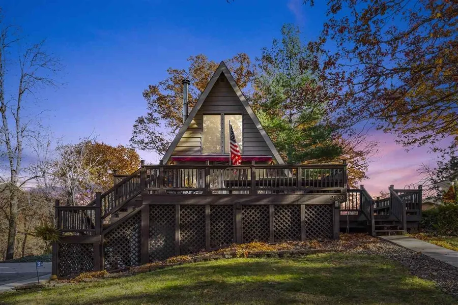 Make this stunning lake home your year-round retreat! Nestled in the woods, this classic A-frame blends rustic charm with modern comfort. Step onto the beautifully maintained deck and feel the peace that surrounds you. Inside, the spacious living room features warm wood beams, soaring vaulted ceilings, and a cozy gas stove—perfect for cool evenings. The kitchen shines with original woodwork and updated appliances, and the formal dining room offers built-ins for extra storage. The main floor includes a full bath and a large primary bedroom with plenty of closet space and a private back deck. Upstairs, enjoy a versatile loft and a second bedroom with its own balcony overlooking the trees. The lower level adds even more living space with a recreation room, vintage bar, updated full bath, laundry, and non-egress bedroom. Outside, you'll find an extra-deep garage with a new concrete drive and...