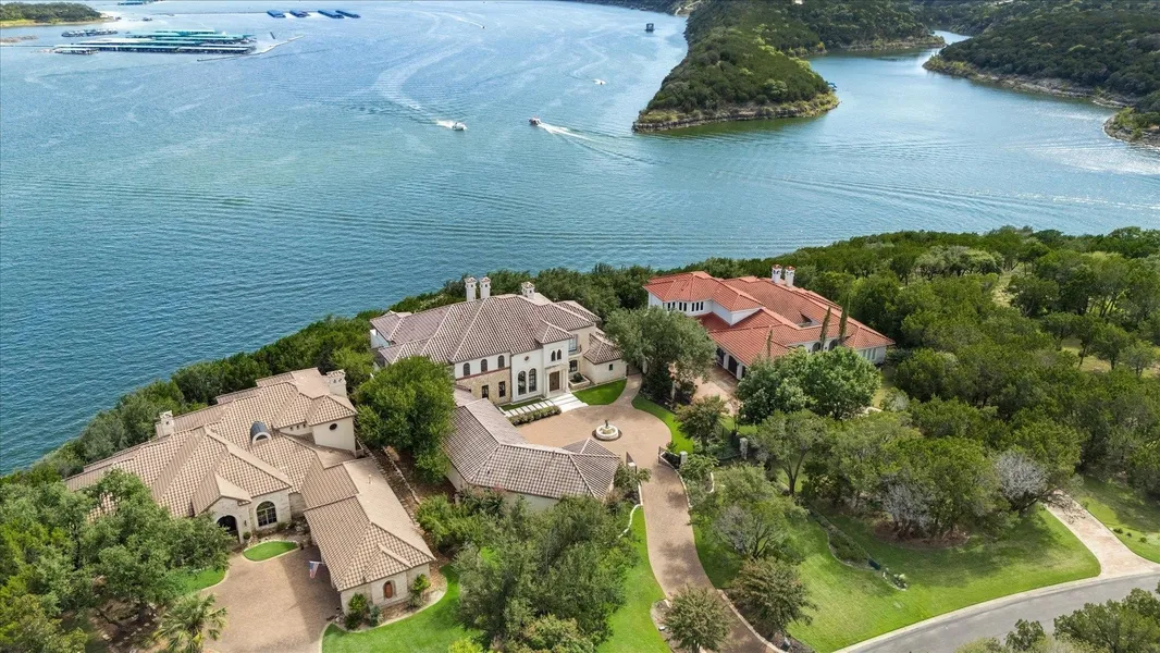 Welcome to this exquisite Northshore Lake Travis lakefront sanctuary in the gated area of The Hollows. With ~ 230’ of lake frontage, this magnificent estate spans an impressive 10,792 sq ft in the main home with an additional separate guest quarters of 910 sq ft, offering an unparalleled experience on a sprawling 3.69 acre lot. This striking Santa Barbara style home was designed by the renowned Jauregui Homes, and showcases beautifully crafted high ceilings, arched details, Segreto finishes and so many intricate touches. The home, pool and spa have been extensively remodeled blending high quality, modern luxuries with Old-World style, unique European pieces and custom lighting fixtures. The hand finished reclaimed hardwood floors, gorgeous Italian imported stained glass, and solid marble Italian columns make this estate a masterful work of art. Antique wood entry doors from a European Monastery open the way to discovering an expansive layout featuring gorgeous common rooms, 6 bedrooms and 9 opulent bathrooms. The primary ensuite with a covered balcony and sweeping lake views is on the main level and is adorned with double wood doors with ivory inlaid accents, spacious spa like bathroom, retreat/yoga studio, and 3 walk in closets. The gourmet kitchen is complemented by 2 islands and multiple workstations, and is open to the massive family room with fireplace and wet bar. The appliances are top of the line, and include a Lacanche French range and dual fuel ovens. Other rooms include a lovely formal living room with fireplace, formal dining room, multiple living areas, well-appointed office, home theater, wine grotto and safe room. Enjoy the breathtaking waterfront views and lovely sunsets! The separate guest quarters include a kitchen, bedroom, full bathroom, living room and laundry facilities. The pool and spa overlook the lake, large covered patio and summer kitchen. The community offers wonderful amenities. This exceptional estate is a testament to refined living.