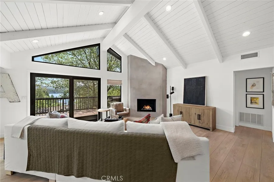 This stunning 4-bedroom, 3.5-bath mountain retreat combines modern upgrades with timeless lodge-style charm, offering captivating lake views from nearly every window. Thoughtfully remodeled in 2020, the home features a bright open floor plan perfect for both comfort and entertaining. The main level showcases a dramatic great room with vaulted ceilings, expansive windows, recessed lighting, and a cozy gas fireplace that opens to a large entertainer’s deck. The remodeled kitchen is a chef’s dream with stainless steel appliances including a refrigerator, shaker-style cabinetry, pantry with pullout shelves, granite counters, peninsula with seating, and large windows framing the view. Two primary suites with spa-inspired baths—one on the main level and another on the lower level—provide privacy and flexibility, while two additional bedrooms and a spacious family room with a second fireplace and walk-out access to the lower deck with a swinging bench create the perfect retreat for family and guests. Outdoor living shines with two expansive decks crafted in durable Trek decking, ideal for gatherings, dining, or simply enjoying the mountain air and lake views. Additional highlights include dual HVAC and A/C systems with split thermostats, vinyl flooring throughout, inside laundry with washer and dryer, a finished pull-through two-car garage with automatic doors on both sides, and ample guest parking. Sold fully furnished for a true move-in ready experience, this home is ideally located just above the trails of North Bay Cove with lake rights, peaceful morning walks, sunset strolls, and easy access off Bay Road with level parking. Just minutes from Blue Jay and Lake Arrowhead Village shops and dining, this exceptional property offers the perfect blend of modern amenities, mountain appeal, and lake lifestyle—whether as a primary residence, weekend escape.