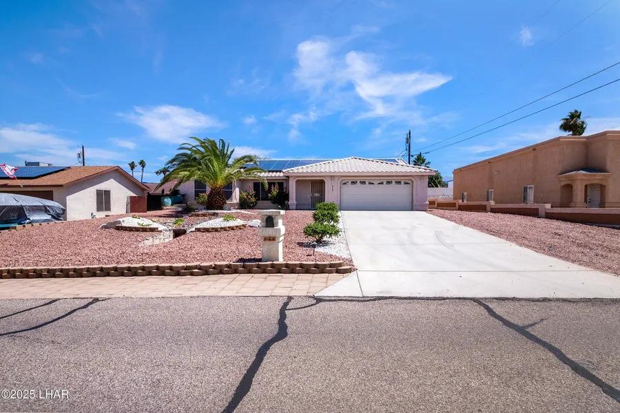 Live the Havasu dream without lifting a finger in this updated home. Start your day or wind down your evening in the oversized living room with Beautiful lake views. Enjoy modern finishes throughout, including new flooring, stylish bathrooms with vessel sinks, and a refreshed kitchen featuring sleek countertops, trendy backsplash, and newer appliances. Peace of mind comes easy with high-security entry doors, a new water heater, and a new garage door opener. Say goodbye to sky-high utility bills with energy-efficient solar, and there's no shortage of space for your toys with a boat-deep 2-car garage and 45' side parking—perfect for your RV, trailer, or desert gear. This is the kind of place you pull into and feel instantly on vacation. No projects, no stress—just unpack and hit the lake.