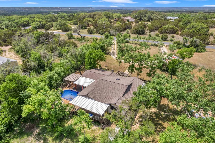 5.16 acres with a house that is just 12 mins outside of Liberty Hill! 23024 Round Mountain Circle, Leander, TX is a 3 bed 2 bath house on 5.16 acres that is fully fenced (some parts of fence needs to be repaired) and cross fenced. When you drive up to the property you will notice gates on both sides of the circle drive and a detached 3 car carport. In the front of the house has a covered porch that over looks the goldfish & koi fish pond. You enter the house and are in the living room that boast a beamed ceiling, wood accent wall, and a electric fireplace. The living room opens up to the dining area and kitchen. The kitchen has marble tile countertops, small island, stainless steel oven, dishwasher, and refrigerator, and pantry. Look out onto your above ground pool and covered deck from the window above the kitchen sink when doing dishes. The master bedroom has laminate wood floors, and double doors that open up to the master bathroom that has a walk in shower, single sink vanity, and multiple glass block windows. The Master Bedroom also has access to the 2nd enclosed patio Like mentioned before the outside of the back of the house is a large deck with an above ground pool and parts of the deck have covered seating areas. Perfect place to hang out during the summer heat. This property is on well water and has a 2500 gallon water tank. In the backyard there is a second pond that can be fixed to retain water. This house will need some TLC, but has so much potential.