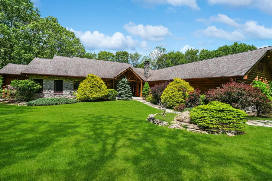 Nestled at the end of a paved cul-de-sac and accessed by a long private drive, this extraordinary 5-bedroom, 5-bathroom log cabin offers the perfect blend of rustic elegance and modern comfort. Set on nearly 7 secluded acres and just minutes from major highways, shopping outlets, and premier Pocono resorts like Kalahari and Great Wolf Lodge, the location is both serene and convenient. A Trex wraparound deck welcomes you into a vaulted great room with soaring ceilings, a striking bluestone hearth with pellet stove, and floor-to-ceiling windows overlooking a beautifully landscaped private yard. The open-concept kitchen features knotty pine cabinetry, Corian countertops, black stainless appliances, a built-in office nook, and both a large walk-in and double-door pantry. The main level hosts a spacious master suite with vaulted ceilings, radiant floor heat beneath ceramic tile, a Jacuzzi tub, oversized walk-in shower, custom double vanity, and walk-in closet. A second bedroom shares a Jack-and-Jill bath with another large bedroom featuring double vanities and ceramic tile accents. Two additional guest bedrooms—one with a private ¾ bath—are situated for privacy. A fifth bedroom is located just off the great room. Downstairs, the finished walk-out basement includes a bonus room, full bathroom with walk-in shower, built-in knotty pine shelving, a custom bar, and access to a bluestone patio and fire pit area—perfect for entertaining. Additional features include a laundry room with ceramic tile, mud closet, powder room, and central air with multi-zone oil heat. A 3-car attached garage with newly epoxied floors connects directly to the home, while a detached 3-car log-built garage with oversized doors and loft space provides abundant storage or workshop potential. A flagpole, basketball court, and manicured grounds complete the exterior amenities. This move-in-ready log home offers a rare opportunity to own a slice of the Poconos in refined comfort.