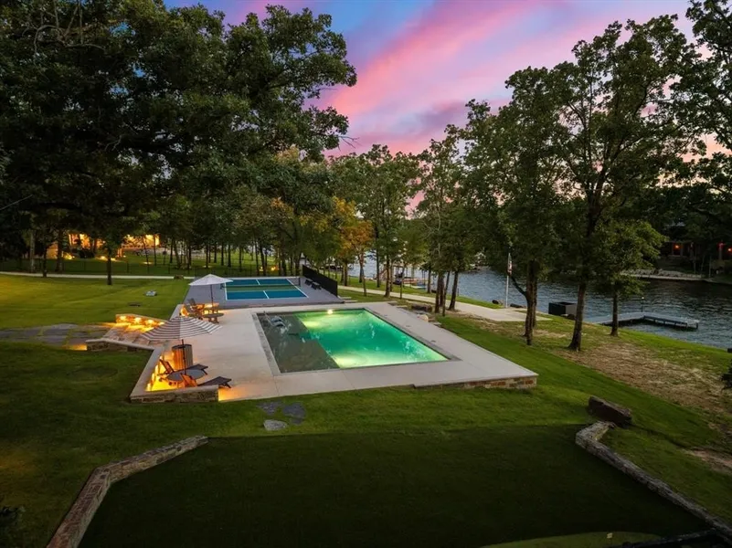 A rare opportunity to own one of the most extraordinary estates in Pinnacle Golf Club on Cedar Creek Lake. Spanning over three waterfront acres with 264 feet of premium shoreline, this exceptional property blends lakeside luxury with resort-style amenities, just over an hour from downtown Dallas. The main residence, built in 2022, offers a modern, open-concept layout ideal for entertaining, featuring four bedrooms, four full ensuite bathrooms, an office, guest half bath, and three-car garage plus a golf cart bay. The attached guest house, completed in 2025, mirrors the main home’s quality and style with three bedrooms, three full bathrooms, guest half bath, and its own four car garage. Together, the two homes provide just under 7,000 square feet of luxurious living space, complemented by over 2,500 square feet of covered outdoor living areas that showcase privacy and spectacular lake views. Outdoor features elevate this estate to a true lakeside retreat, including a large boathouse and separate fishing pier, private lakeside pool, private artificial turf putting green, outdoor kitchen and living area, and the only private pickleball court in Pinnacle Golf Club. Located just a golf cart ride to the clubhouse, tennis courts, and championship golf course, this property combines privacy, elegance, and access to one of the lake's premier communities. With high-end finishes throughout, outdoor shower, spacious lakeside firepit, dedicated hammock area, and the guest house garage wired for a golf simulator, every amenity has been thoughtfully designed for luxury lake living at its finest.