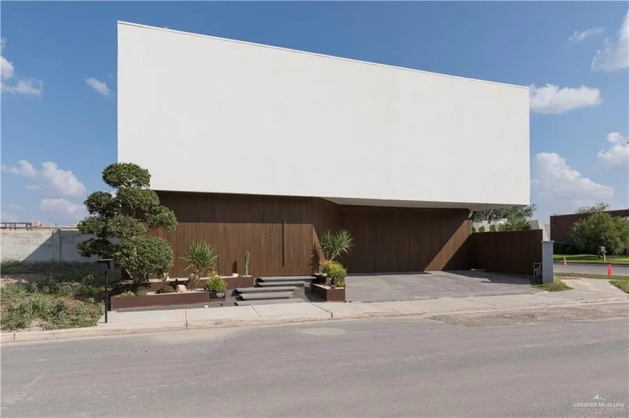 Modern luxury home with a unique architectural design offering extra privacy. Custom metal and wood construction with stucco and WPC exterior finishes. Grand oversized windows, designer low-maintenance landscaping, natural stone paver driveway, lava stone entry with LED lighting, firepit area, jacuzzi, and outdoor kitchen with built-in Green Egg, granite bar, sink, and stainless storage. Automatic bifold garage doors, garage cabinetry, hidden exterior TV, spray foam insulation, and TPO roof.