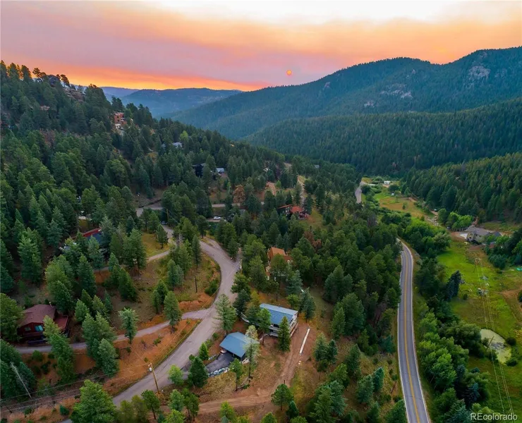 A detached oversized two-car garage, with extra storage below, is accessible via a charming bridge. The home offers multiple heating options—radiant ceiling heat, a new boiler, passive solar, and a wood-burning stove—making winter living affordable. Located just 5 minutes from both Maxwell Falls Trailheads and National Forest trails, 12 minutes from downtown Evergreen, and 16 minutes from Aspen Park, this home embodies the essence of mountain living! Check out for more pictures, video and information!