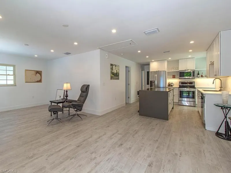 ROYAL HARBOR / Bay Park neighborhood - FANTASTIC LOCATION - within 2 miles to Fifth Avenue South, Tin City and the beach. ISLAND KITCHEN, OPEN LIVING PLAN. FANTASTIC Opportunity for primary residence or designer rental. NO HOA FEES. Bay Park neighborhood next to Private drive entry on Church Avenue to a fenced and gated yard. COMPLETE REMODEL. Grey, wide, plank-style tile flooring throughout, new panel doors throughout with brushed nickel hardware. An open floor plan design with a kitchen island waterfall quartz countertop, white shaker style cabinets, matching quartz counters and stainless appliance. The separate dining room has a built-in sideboard with white cabinets and quartz counter extending the theme from the kitchen. Featuring kitchen cabinets and drawers that soft close, under cabinet lighting, open shelves and additional cove lighting. Stainless appliances in kitchen. Primar...