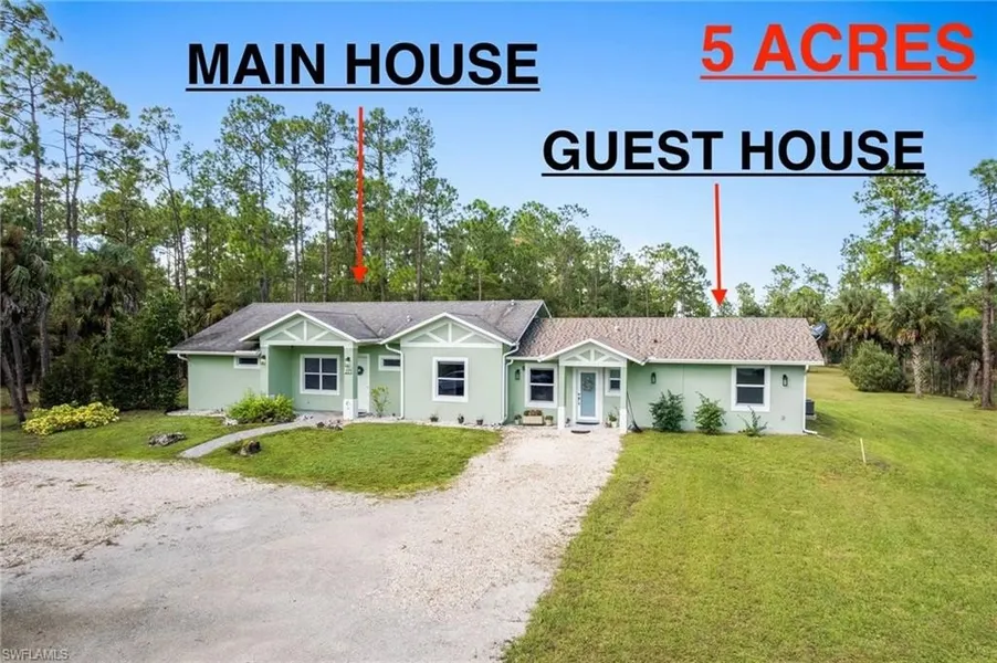 2012 BUILT 3/2 MAIN HOUSE ON ONE SIDE, ATTACHED 2/1.5 GUEST HOUSE ON THE OTHER SIDE ADDED IN 2024. ALL UNDER ONE ROOF! 5 GORGEOUS MOSTLY CLEARED ACRES ON A CANAL! Impact windows and doors throughout! This versatile property in the fast-growing Golden Gate Estates perfect for multigenerational living, extended family, or use as a private office or studio. The main house features 3 bedrooms and 2 bathrooms, with 8 ft doors everywhere, a new stainless steel refrigerator and dishwasher, and TVs in the living room and lanai included. The guest house, added in 2024, includes 2 bedrooms and 1.5 bathrooms, 8 ft doors everywhere, tankless water heater, electric blinds, and all brand-new finishes throughout. Both the main house and guest house have separate entrances and their own large lanais, offering comfort and privacy for all. The property is fully fenced and has plenty of open land for future expansion, a pool, shop building, or storage. A 10x30 lean-to in the backyard provides the perfect space for animals or extra storage. This gorgeous mostly cleared 5-acre lot sits at the end of the street on a canal, providing peaceful views and privacy. Situated in Golden Gate Estates, enjoy privacy while being just minutes from new shopping centers, dining options, parks, A-rated schools, and a short drive to Naples’ white sandy beaches—offering the ideal balance of seclusion, convenience, and long-term value. (Renderings that showcase furniture have been virtually staged) THIS PROPERTY QUALIFIES FOR A 1% LENDER INCENTIVE IF USING PREFERRED LENDER, INQUIRE FOR MORE DETAILS**