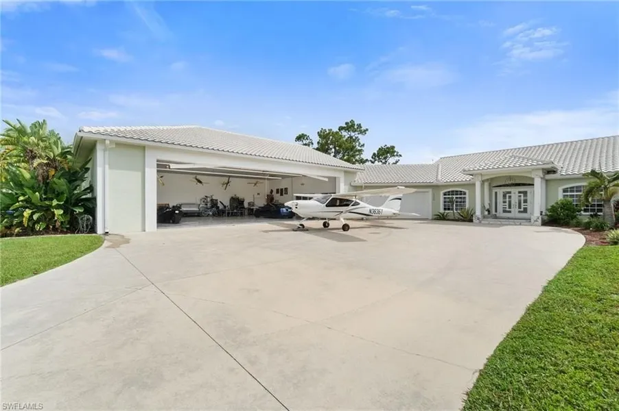 Welcome to the ultimate dream home in Pine Shadow Air Park- 94FL, where luxury meets convenience for aviation enthusiasts & car collectors alike. This stunning property, set on over an acre by the lake, offers an unparalleled private lifestyle. Imagine stepping into the expansive 3,187 sqft residence, boasting 4 spacious bedrooms, a den/office, 2 full baths, & 2 half baths, all framed by soaring 10ft to 17ft ceilings. The heart of this home is its modern kitchen, equipped with granite countertops and stainless-steel appliances, perfect for both casual meals and gourmet creations. The living room & great room provide vast spaces for entertaining or simply relaxing with family & friends. The primary bedroom is a true retreat, with French doors leading to a serene lanai. Its luxurious ensuite bath, featuring dual sinks, a soaking tub, and a walk-in shower, promises a daily spa-like experience. Guests will feel equally pampered with their own bath offering dual sinks and a walk-in shower. For those with a passion for prized possessions, the property includes an impressive 1,191 sqft oversized 2+ car garage connected to a 2,700 sqft climate-controlled hangar with an opening of 42.5ft wide & 14ft high. This expansive area, finished with marble tile floors, has sliding glass doors that seamlessly merge the garage & hangar, creating an ideal space for your car collection or aviation needs. The outdoor amenities are equally spectacular, featuring a custom oversized saltwater heated pool with LED color-changing lights, water features, and a sun shelf for tanning. Relax in the large spa or on the 5,719 sqft lanai with 12ft ceilings & vaulted screens, which includes two rear patios overlooking the shimmering lake. An outdoor tile shower & pool bath off the lanai add to the convenience. Experience this home at night when the driveway lights resemble a runway & the house is beautifully accented with trim lights. The pool lights & fountains create a mesmerizing ambiance, making this property the ultimate entertaining space. It’s a utopia where you can relax and enjoy stunning sunsets over the lake. Pilots will appreciate the seamless taxi experience from your doorstep to the community's private lighted asphalt runway, extending over 3,195 feet with an overrun & an on-site self-serve fueling station. This home is a must-see for anyone passionate about aviation or car collecting, embodying a lifestyle of luxury & ease. Don’t miss this opportunity to own a slice of paradise, perfectly tailored for your unique passions. Discover unparalleled value with this prime waterfront home. While waterfront lots are scarce, this property offers a ready-made opportunity that far exceeds the cost and hassle of building new. Enjoy an expansive house & massive pool without construction delays or additional expenses. Perched 22 feet above sea level, this is one of the finest homes in the community, boasting resilience against recent hurricanes. Secure your dream home today!