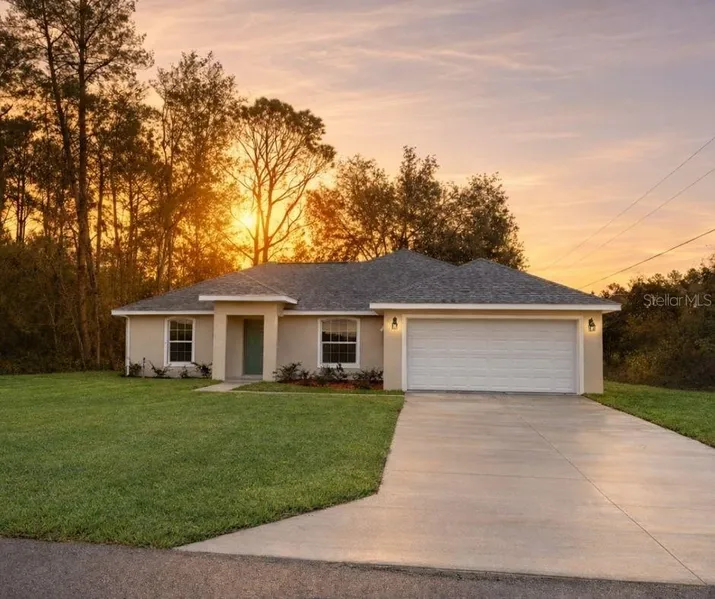 One or more photo(s) has been virtually staged. Buyer assistance program offering $75,000 or $100,000 in funds towards purchasing this home; limited availability. Mature backyard trees provide year-round comfort in the no-HOA community of Marion Oaks. This award-winning 3-bedroom, 2-bath concrete block home features 11-foot cathedral ceiling in the living room and kitchen, oversized master bedroom featuring tray ceiling, large walk-in closet, double vanity sinks, and French doors leading to a 12' x 24' screened-in patio with dual ceiling fans... all standard. Granite countertops and wood cabinetry are featured throughout kitchen and bathrooms, including the kitchen’s 8 ft counter that is ideal for entertaining. Full stainless appliance package, a finished two-car garage with sealed floor, and for comfort of mind, a 2-10 Home Buyer’s Warranty.