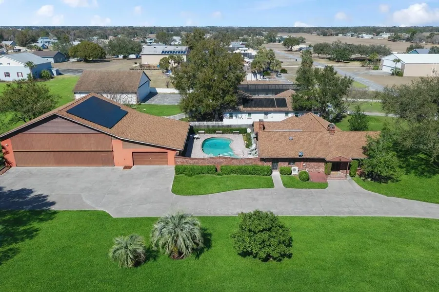One or more photo(s) has been virtually staged. Welcome to a rare opportunity in the Leeward Air Ranch, a gated Central Florida airport community. Warm and inviting 3/2 brick home with large hangar on 1.77 acres is offered only to licensed pilots! Enjoy the view from your living room with wood burning fireplace and cathedral ceiling with exposed beams. Windows at the front and back of the home go all the way to the top for lots of natural light. Wide plank, solid hardwood floors are beautiful and made to last. See and feel the quality. The primary suite is 20x20 with a fireplace and opens through French doors to the huge Florida room looking out to an in-ground saltwater pool. Paver decking leads you beyond the private courtyard to the 50x60 hangar. With a door opening of 50x14'4" or higher you can store your airplane and also fit an RV and/or boat. There’s so much more! Attached to the hangar are a 2 car garage and an apartment with full kitchen, full bath and laundry-- ideal for guests, extended family or pilot quarters. Want to change your own oil? There's a maintenance pit with water and power! Need more storage? Check out the full basement! New shingle roof was installed on both the house and hangar in 2019. Whole house solar panels installed in 2025 will keep the electric bill low (new owner to assume the lease) and house is on well and septic-- no water or sewer bills! Taxi from your home to the north/south runway, a reinforced and lighted grass strip 6200 x 165. Many activities await the new owner such as fly-in's and weekly fly-out's with blue skies all year long. Non-aviation activities include art, bingo, exercise, music events, hangar happy hours, motorcycle rides, etc. Celebrate the holidays with your neighbors in our Red Barn Community Center. Golf enthusiasts will love the 18 hole course nearby. Low, low HOA fees! Don't wait, make this house your forever home. Priced right so you can update to your style!