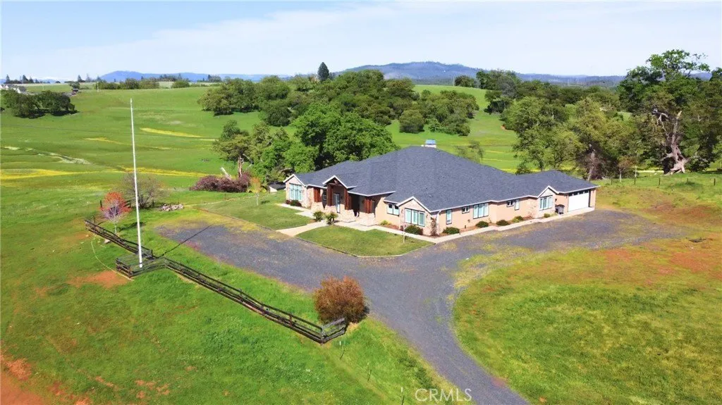 The California wild flowers have arrived on Table Mountain. Experience ranch style living, practicality, and natural beauty in this extraordinary luxury estate. From the moment you step inside, you’ll be captivated by the soaring 20-foot vaulted, beamed ceilings and the seamless open floor plan, designed for effortless entertaining. Light, neutral walls pair beautifully with the striking floor-to-ceiling stone fireplace, creating a warm and welcoming atmosphere. This is more than a home; it’s a place to truly unwind and enjoy. The gourmet kitchen is a culinary masterpiece, featuring granite countertops, custom soft-close cabinetry, a sleek tile backsplash, and premium LG stainless steel appliances. It also includes thoughtful details like a separate warming drawer, under-counter ice maker, and two spacious islands with seating—ideal for hosting guests or enjoying casual family meals. Behind elegant double doors lies the luxurious primary suite, a private retreat designed for ultimate comfort. This spacious haven includes room for a cozy seating area, an expansive walk-in closet with its own laundry station, and a spa-like en suite bathroom. The bathroom boasts dual sinks, a dedicated vanity, a relaxing soaking tub, and a large tiled walk-in shower with dual showerheads. Each additional bedroom also features its own en suite bathroom, providing comfort and privacy for everyone. Additional features throughout the home include custom alder cabinetry, recessed lighting, plantation shutters, custom doors, a large laundry room with ample storage and a utility sink, his and hers offices and even a panic, gun, and safe room located off the primary suite. Spanning over 215 acres, this fenced and gated property is a true haven of possibilities. Outdoor amenities include a magnificent covered patio with ceiling fans, an outdoor television, a personal sauna, a sparkling in-ground saltwater pool, and 18-person hot tub overlooking the serene meadowland. Aviation enthusiasts will appreciate the detached 40’ x 40’ Quonset Hut, perfect for use as a shop, RV parking, or airplane hangar, with the added convenience of a 1,900-foot natural grass landing strip. All of this is set against the breathtaking backdrop of 360-degree mountain and valley views, with Table Mountain and Phantom Falls at your doorstep. This estate offers more than just a home—it’s a lifestyle of privacy, modern elegance, and boundless outdoor adventure.