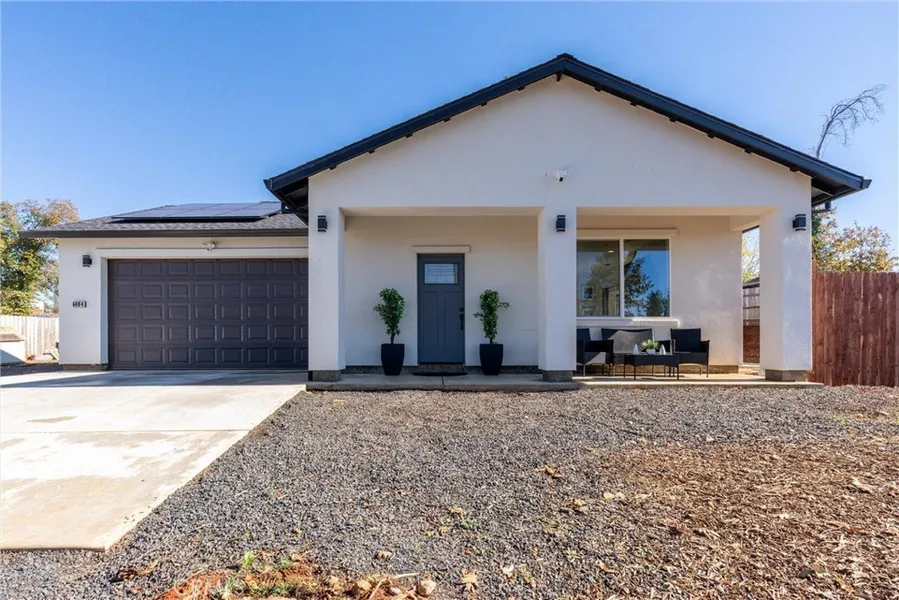 Welcome to a home that blends modern comfort with thoughtful design. This beautifully finished 2-bedroom, 2-bath residence offers an open, inviting layout perfect for everyday living. The impressive kitchen features soft-close cabinetry, a spacious pantry, a large island, and sleek quartz countertops, all flowing into a bright living area centered around a cozy electric fireplace. With 9 ft ceilings and durable LVP flooring throughout, the home feels open and cohesive. The oversized indoor laundry room with built-in cabinetry adds convenience you’ll truly appreciate. The primary suite is a relaxing retreat, offering a spacious layout, a custom walk-in closet, and a stylish bathroom with double sinks, quartz counters, and beautiful tile work. The secondary bedroom provides great natural light, a generous closet, and nearby access to a spacious guest bath designed with the same high-end finishes. An oversized two-car garage offers abundant storage, while the exterior of the property is just as appealing. Enjoy a welcoming covered front porch, large front and side yards, room for RV or boat parking, fenced areas, and a back patio perfect for relaxing or entertaining. Practical upgrades include underground drainage, a sliding glass door to the yard, owned solar, and a brand-new septic system, offering peace of mind for years to come.