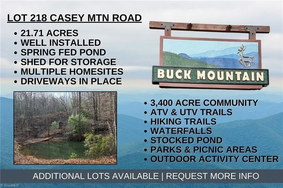 RARE FIND IN BUCK MTN - 21.71 acres w/PRIVATE WELL, SPRING-FED POND, ELECTRIC, SHED, SPRING, MTN VIEWS, ROADS & TRAILS for easy exploration. Lot 218 offers multiple building sites. Choose your spot & build the mtn home you’ve been dreaming about! Private Setting–Borders POA property to the east. Enjoy tranquil sounds of Little Creek running near the east property line. Located in 3,400 acre Buck Mountain... ONLY GATED ATV COMMUNITY in Wilkes Co. FIBER OPTIC available. Long & short-term rentals allowed. Travel Time to Buck Mtn: Winston 1hr, Charlotte 1hr40min. Centrally located 35 min to Boone, West Jefferson & Wilkesboro. Close to High Country Activities, BLUE RIDGE PKWY, ASU, shopping, dining, golf, wineries, breweries, mtn biking & skiing. BUCK MTN AMENITIES: ATV & Hiking Trails, Parks, Fishing Pond, Water Falls, Pavilions, Community Ctr, Helipad, Outdoor Activity Ctr w/amphitheater for concerts & community gatherings. 1,400 SF min. NO TINY HOMES. NO MOBILE HOMES. NO SELLER FINANCING.