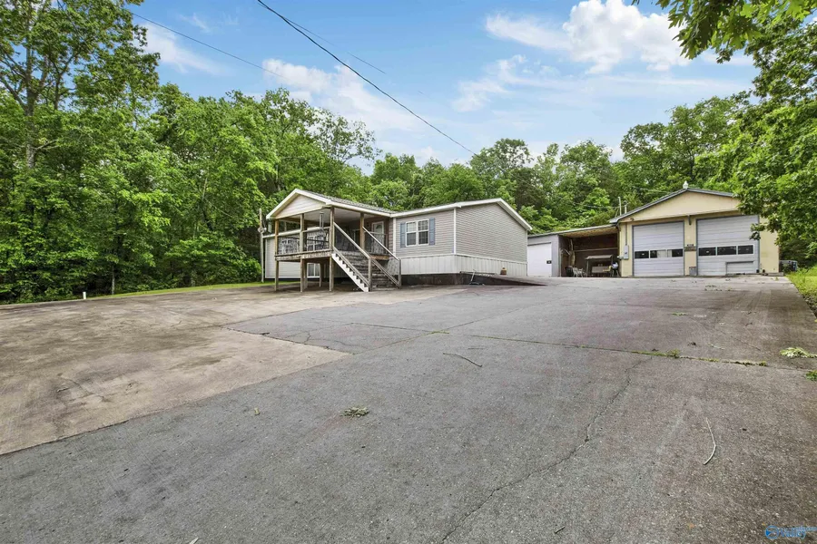 Home and Business! 1.1 Acres of Serenity! KABCO Builders Model K-3216 32x64 home with “Hardi-Plank” Fascia & Eaves on a PERMANENT FOUNDATION and large driveway (700 yards of concrete) for additional parking. Home features updated flooring, large primary bedroom and bath 16x32 walk-in closet, whirlpool tub and sperate shower, and double vanity. 2 additional bedrooms and full bath. Large, open living and dining room. Custom covered porch on front of home to watch the sunset. Incredible heated 3 Bay Workshop 70x70 with sperate power meter. Cabinet machinery negotiable. Enjoy the waterfall in your own backyard!