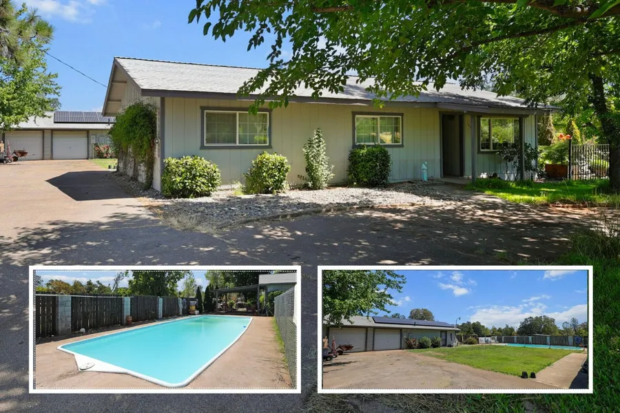 The property is designed for comfort and flexibility with a detached 2-car garage that includes about 529sq/ft of living space, a kitchenette, and bathroom. Outside, enjoy the inground pool, covered patio, lush landscaping, fruit trees, and fenced/cross-fenced land—plus the benefit of Ag water rates.