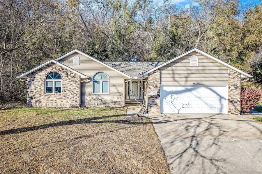 This charming 3-bedroom, 2-bath ranch offers a perfect blend of comfort and warmth, nestled against a serene wooded backdrop for added privacy. Step inside to a bright, open layout featuring a spacious living room with vaulted ceilings, large windows, and a cozy fireplace--ideal for gatherings or quiet evenings at home. The kitchen features beautiful oak cabinetry, ample counter space, and stainless steel appliances, making meal prep a delight. Enjoy casual dining at the breakfast bar or entertain with ease in the open-concept flow. The basement is unfinished & ready for your finishing touches. Outside, you'll love the peaceful setting, mature trees, and easy-care exterior with brick accents and an attached two-car garage.